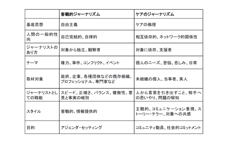 一方で「ケアのジャーナリズム」では記者は、個人や素人を取材対象に選び、その関係に頼ったり支援者的役割をすることがある。取材は人間の苦悩や日常を聞き取ることで、職能は言葉を引き出すこと、思いやりを示すことだという。